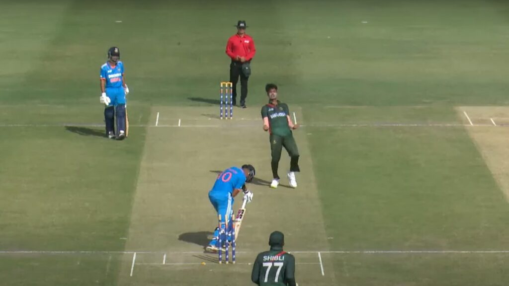 টস হেরে ব্যাট করতে নেমে শুরুতেই হোঁচট খায় ভারত। টাইগার পেসারদের বোলিং তোপে দলীয় ১৩ রানের মধ্যে তিন ব্যাটারকে হারিয়ে ব্যাকফুটে চলে যায় তারা। এরপর প্রিয়াংশু ও শচিন মিলে দেখেশুনে খেলতে থাকেন। তবে সেই চেষ্টা ব্যর্থ করে দেন রোহানাত বর্ষন। ২২ বলে ১৬ রান করা শচিন দাসকে বোল্ড করে ফেরান সাজঘরে।