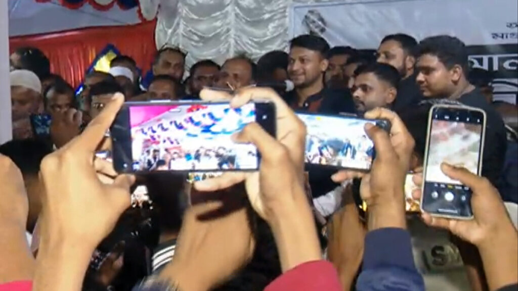 কেউ যখন কথা শুনছে না, তখন সাকিব দু’মিনিটের মধ্যে তার বক্তৃতা শেষ করেন। বলেন, উন্নয়নের জন্য নৌকায় ভোট দিতে হবে। আর তাহলে শেখ হাসিনার হাত শক্তিশালী হবে, দেশের উন্নয়ন হবে।