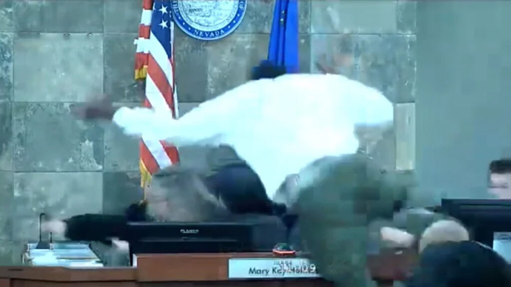 কোর্টরুমে এমন কাণ্ডের একটি ভিডিও ছড়িয়ে পড়েছে সামাজিক মাধ্যমে। ভিডিওতে দেখা যায়, লাস ভেগাসে ক্লার্ক কাউন্টির বিচারক ম্যারি কে হোলথাসের ওপর হঠাৎ ঝাঁপিয়ে পড়ে আসামি। আকস্মিক হামলায় নিজের চেয়ার থেকে পড়ে যান বিচারক। পেয়েছেন আঘাত।
