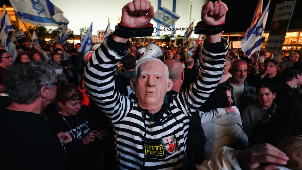 প্রতিরক্ষা মন্ত্রণালয়ের সামনে প্রতিবাদে অংশ নেন কয়েকশ’ ইসরায়েলি। দাবি, জিম্মি মুক্তির বদলে রাজনৈতিক স্বার্থসিদ্ধিকে বেশি গুরুত্ব দিচ্ছে নেতানিয়াহু প্রশাসন। হামাসের অভিযানের শততম দিন পার হয়ে গেলেও জিম্মিদের ফিরিয়ে আনতে চরমভাবে ব্যর্থ সরকার। নেতানিয়াহুকে অযোগ্য আখ্যায়িত করেন তারা। নেতানিয়াহুর দ্রুত পদত্যাগের দাবিও তোলেন তারা।
