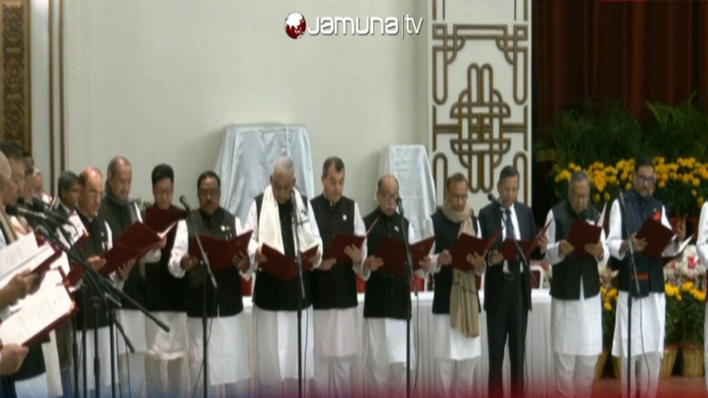 বঙ্গভবনে শপথ নিয়েছেন নতুন মন্ত্রিসভার সদস্যরা। তাদের শপথবাক্য পাঠ করান রাষ্ট্রপতি মো. সাহাবুদ্দিন। বৃহস্পতিবার সন্ধ্যা ৭টার দিকে শপথগ্রহণ অনুষ্ঠান শুরু হয়। বৃহস্পতিবার সন্ধ্যা ৭টার দিকে শপথগ্রহণ অনুষ্ঠান শুরু হয়। প্রধানমন্ত্রী শেখ হাসিনাকে শপথবাক্য পাঠ করান রাষ্ট্রপতি মো. সাহাবুদ্দিন। এরপর মন্ত্রী ও প্রতিমন্ত্রীদের শপথবাক্য পাঠ করানো হয়।