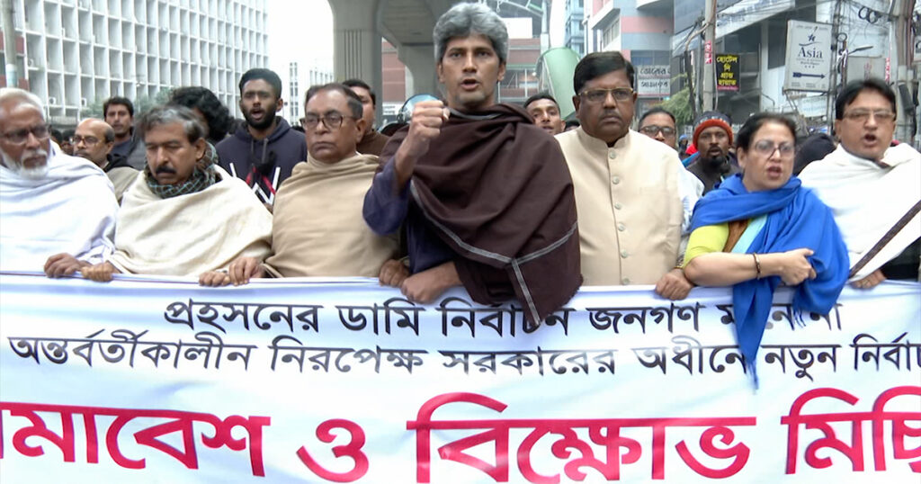 ‘প্রহসনের ডামি নির্বাচন’ বাতিল করে অন্তর্বর্তীকালীন নিরপেক্ষ সরকারের অধীনে পুনরায় নির্বাচনের দাবিতে শুক্রবার রাজধানীতে সমাবেশ ও বিক্ষোভ মিছিল করেছে গণতন্ত্র মঞ্চ। বিকেলে জাতীয় প্রেসক্লাবের সামনে অনুষ্ঠিত সমাবেশে সভাপতিত্বের বক্তব্যে এ দাবি করেন তিনি।