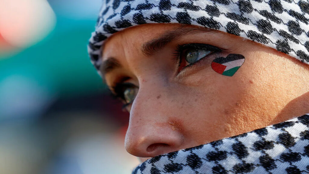 আন্তর্জাতিক বিচার আদালতের বাইরে ফিলিস্তিনের পক্ষে বিক্ষোভ করছেন একজন ডাচ নারী। মুখে ফিলিস্তিনের পতাকা এঁকেছেন। পতাকা