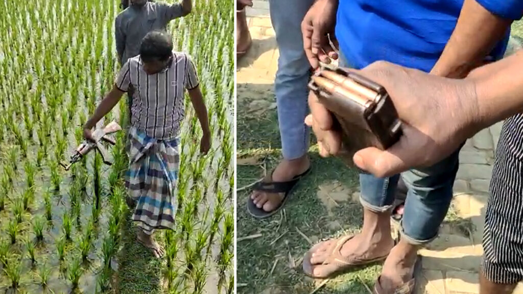 যুদ্ধের এসব সরঞ্জাম কুড়িয়ে আনার এমন একটি ভিডিও এসেছে যমুনা টেলিভিশনের হাতে। ভিডিওতে দেখা যায়, কয়েকজন লোক সীমান্তের পাশের খোলা মাঠ থেকে একটি রাইফেল এবং বেশ কয়েক রাউন্ড গুলিভর্তি ব্যাগ কুড়িতে নিয়ে আসছেন। তাদের পাওয়া আরও একটি ছোট ব্যাগে দুইটি গ্রেনেডও ছিল। তবে এই অস্ত্রগুলো কাদের, তা এখনও নিশ্চিত হওয়া যায়নি।