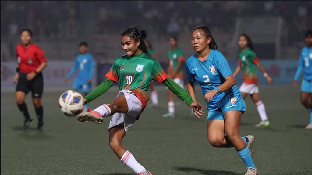 বৃহস্পতিবার (৮ ফেব্রুয়ারি) সন্ধ্যা ৬টায় ঢাকার বীরশ্রেষ্ঠ শহীদ সিপাহী মোহাম্মদ মোস্তফা কামাল স্টেডিয়ামে ফাইনালে মুখোমুখি হয় স্বাগতিক বাংলাদেশ ও ভারত। ম্যাচের ১০ মিনিটেই এগিয়ে যায় ভারত। গোলে শোধে মরিয়া সাগরিকা-স্বপ্নারা বারবার আক্রমণে উঠলেও গোলের দেখা পাচ্ছিলেন না। প্রথমার্ধে ১-০ ব্যবধানে পিছিয়ে থেকেই বিরতিতে যায় বাংলাদেশ।