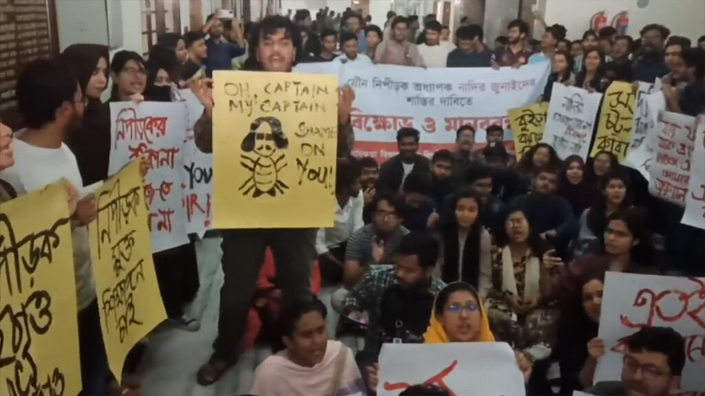 এক নারী শিক্ষার্থীকে যৌন হয়রানি এবং মানসিক নিপীড়নের অভিযোগে ঢাকা বিশ্ববিদ্যালয়ের গণযোগাযোগ ও সাংবাদিকতা বিভাগের অধ্যাপক ড. নাদির জুনাইদের বিরুদ্ধে বিক্ষোভ করছেন শিক্ষার্থীরা। ওই শিক্ষকের বিরুদ্ধে তদন্তের পর দ্রুত শাস্তির দাবি উঠেছে।