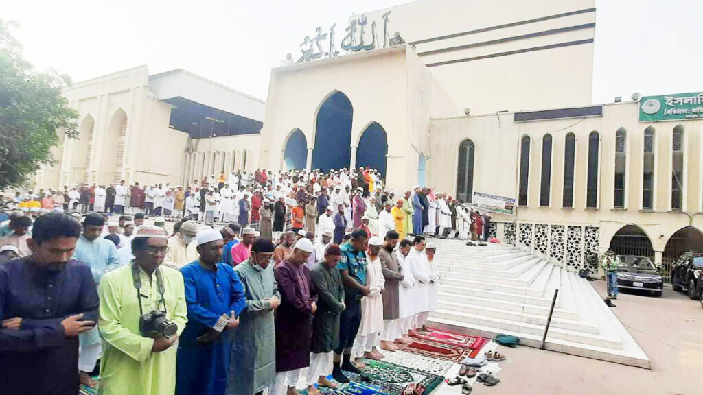ফজরের নামাজের পর থেকে ঢাকার বিভিন্ন এলাকা থেকে জায়নামাজ হাতে জাতীয় মসজিদে আসতে শুরু করেন মুসল্লিরা। ঈদের নামাজ আদায় শেষে দেশ ও জাতির মঙ্গল কামনায় মহান আল্লাহর কাছে প্রার্থনা করেন মুসল্লিরা। নামাজ শেষে ধর্মপ্রাণ মুসল্লিরা কোলাকুলির পাশাপাশি ঈদের শুভেচ্ছা বিনিময় করেন একে অপরের সাথে।
