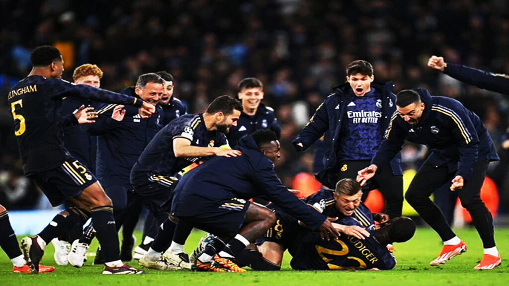 টাইব্রেকারে প্রথমে এগিয়ে থাকে সিটি। প্রথম শটে আলভারেজ লক্ষ্যভেদ করতে পারলেও রিয়ালের হয়ে ব্যর্থ লুকা মড্রিচ। কিন্তু এরপরেই গল্প মোড় নেয় অন্যদিকে। সিটির দ্বিতীয় শট নিতে আসে সিলভা। ফিরিয়ে দেন রিয়াল গোলরক্ষক। আগের সতীর্থের মতোই ব্যর্থ কোভাসিচও। পিছিয়ে পড়ে সিটি। এরপর সিটি আর কোনো ভুল করেনি, ফিল ফোডেন ও এডারসন ঠিকই জালের দেখা পান। অপরদিকে সফল রিয়ালও। একে একে জুদে বেলিংহ্যাম, লুকাস ভাসকেজ ও নাচোর পর জাল খুঁজে পান রুডিগারও। পেনাল্টিতে ৪-৩ গোলে জিতে সেমিফাইনালে উঠে টুর্নামেন্টের রেকর্ড ১৪ বারের চ্যাম্পিয়ন রিয়াল মাদ্রিদ।