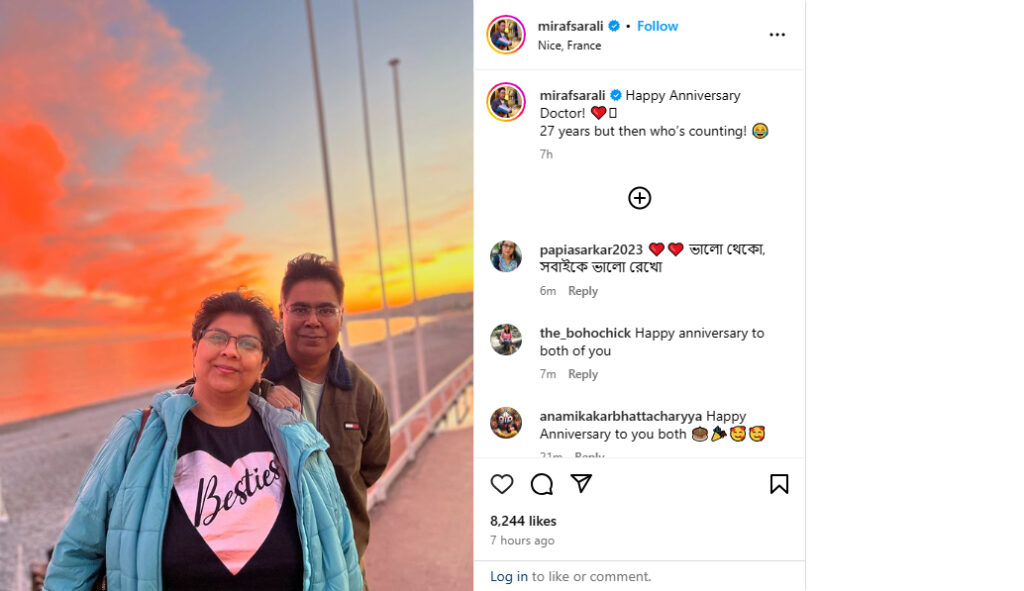 বিবাহবার্ষিকীতে স্ত্রীকে সামাজিক যোগাযোগমাধ্যমে শুভেচ্ছা জানিয়েছেন মিরাক্কেল খ্যাত মীর। সেখানে স্ত্রীর সাথে ছবি দিয়ে তাকে লিখেছেন ‘হ্যাপি অ্যানিভার্সারি ডাক্তার। ২৭ বছর, তারপর আর কে গোনে…’।