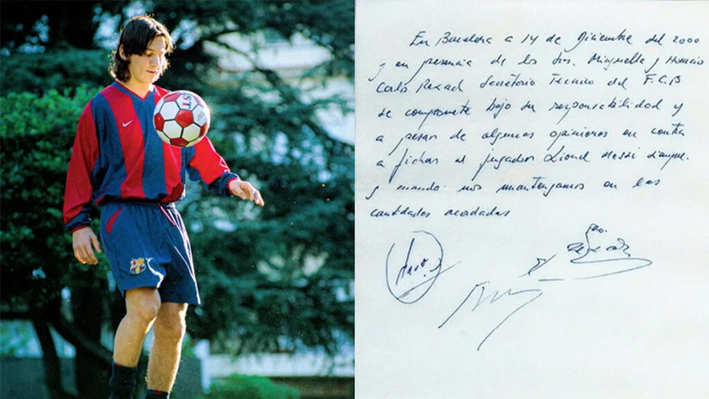 ২৪ বছর আগের কাহিনী। ডিসেম্বরের এক দুপুরে ১৩ বছর বয়সী রোজারিওর ছোট্ট ছেলে লিওনেল মেসির সঙ্গে চুক্তি হয় কাতালান ক্লাব বার্সেলেনার। ক্লাব ক্যাফেটেরিয়ায় দুপুরের খাবার খেতে বসে বার্সার ক্রীড়া পরিচালক কার্লোস রেক্সাস, এজেন্ট হোরাসিও গ্যাগিওলি আর ট্যালেন্ট হান্ট স্কাউট হোসে মারিয়া মিঙ্গুয়েলার উপস্থিতিতে লিও’র সঙ্গে বার্সার চুক্তি হয় একটি ন্যাপকিন পেপারে। এরপরের গল্পটা লেখা ইতিহাসের পাতায়।