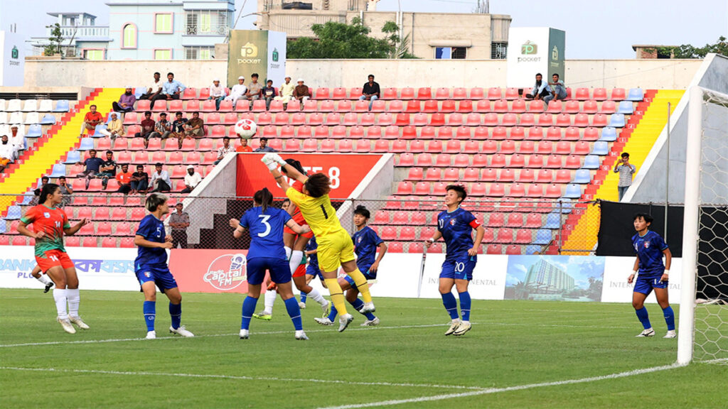 শুক্রবার (৩১ মে) স্বাগতিক হিসেবে খেলতে নামে বাংলার বাঘিনীরা। দলের কোচ বাটলার এদিন ৩-৫-২ ফরম্যাশনে খেলান বাংলাদেশকে। তবে সব পরিকল্পনা ভেস্তে দিয়ে ম্যাচের শুরু থেকে শেষ পর্যন্ত দাপট দেখিয়েছে সফরকারীরা। ম্যাচের ১১ মিনিটে প্রথম গোল হজম করে পিছিয়ে পড়ে বাংলাদেশ। বক্সের ভেতরে বল পেয়ে খুঁজে নেয় ইয়ু সুয়ানকে। তার বা পায়ের মাপা শটে বল জালে জড়ালে লিড পায় তাইপে।।