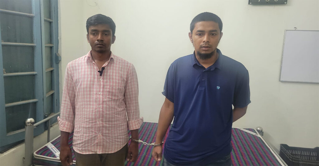 আটককৃতরা হলেন, চাঁদপুর জেলার মতলব দক্ষিণের দক্ষিণ পশ্চিম দিঘলদি এলাকার মৃত পন্ডিত আলী বেপারীর ছেলে হাবিবুর রহমান সুমন (৩০) এবং একই এলাকার দেলয়ার হোসেন গাজীর ছেলে রবিউল আওয়াল রবি (২৮)।