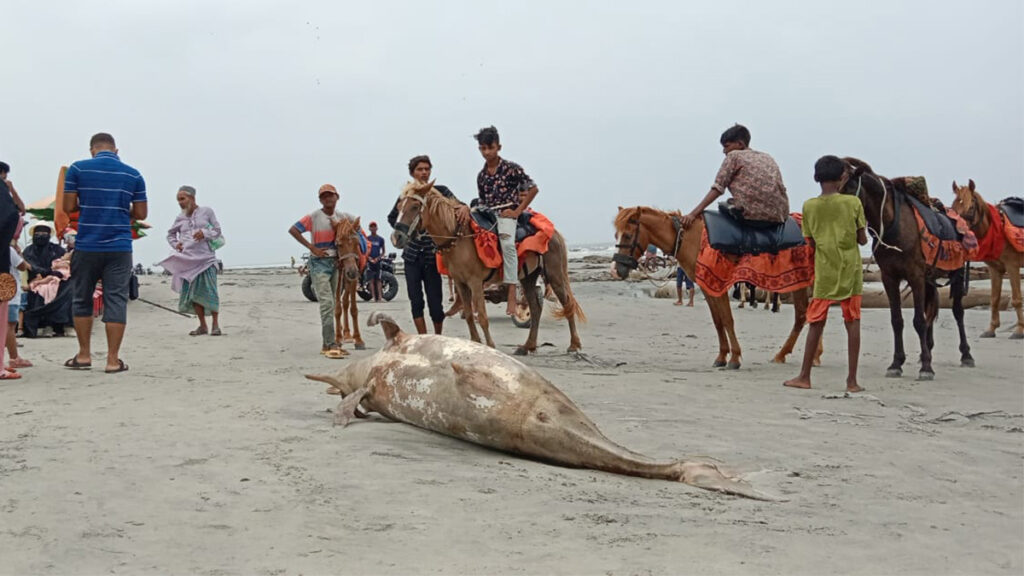 পটুয়াখালীর কুয়াকাটা সমুদ্র সৈকতে প্রায় ১০ ফুট লম্বা একটি মৃত ডলফিন ভেসে এসেছে। ধারণা করা হচ্ছে ডলফিনটি বোটলনোজ প্রজাতির। শুক্রবার (১৪ জুন) সকালে কুয়াকাটা সৈকতের জিরো পয়েন্টের পূর্ব পাশে ডলফিনটি দেখতে পায় স্থানীয়রা।