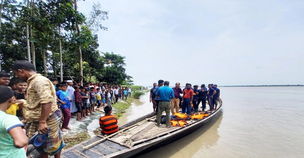 কুড়িগ্রাম ফায়ার সার্ভিসের সিনিয়র স্টেশন অফিসার শরিফুল ইসলাম বলেন, একই পরিবারের চারজনসহ ছয়জন নিখোঁজ রয়েছে এমন শোনা যাচ্ছে। তাদের মধ্যে চারজনই শিশু, যাদের বয়স ১০ বছরের কম। আমাদের ডুবুরির দল কাজ করছে। বৈরী আবহাওয়া এবং নদীর তীব্র স্রোত থাকায় কাজ করতে বেগ পেতে হচ্ছে।