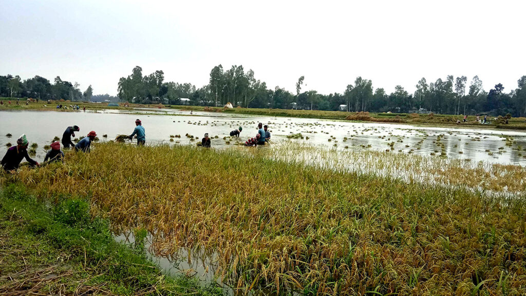 বকবান্দা গ্রামের কৃষক আমিনুল ইসলাম বলেন, পাকা ধানক্ষেত বন্যার পানিতে ডুবে গেছে। ধান কাটার লোক পাওয়া যাচ্ছে না।