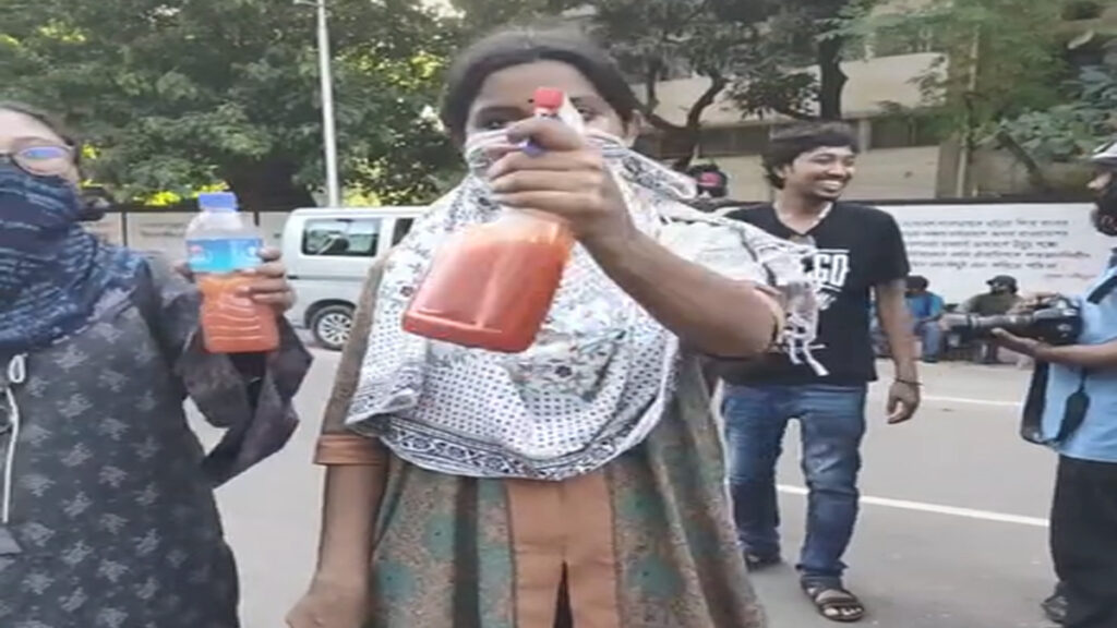 হাতে মরিচের গুঁড়ার পানিমিশ্রিত স্প্রে নিয়ে বেশ কয়েকজন নারী শিক্ষার্থীকে কোটা আন্দোলনে দেখা গেছে। মঙ্গলবার (১৬ জুলাই) বিকেলে কেন্দ্রীয় শহীদ মিনার চত্বরে ঢাকা বিশ্ববিদ্যালয়ের কয়েকজন ছাত্রীর হাতে মরিচগুঁড়ার।