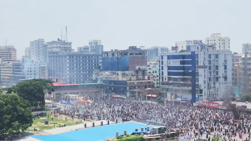 সংঘর্ষের সময় সাউন্ড গ্রেনেড ও টিয়ারশেল নিক্ষেপ করে পুলিশ ও র্যাব। আন্দোলনকারীরা হাউজ বিল্ডিং থেকে রাজলক্ষী মোড় পর্যন্ত সড়কে অবস্থান করছেন।