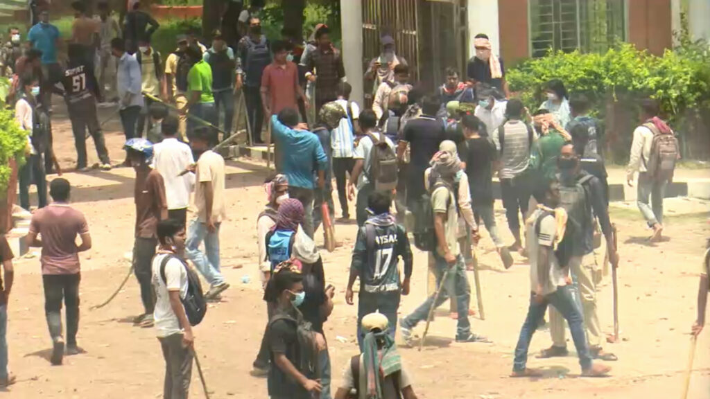 আইনশৃঙ্খলা রক্ষাকারী বাহিনীর সদস্যদের লক্ষ্য করে ইটপাটেকল নিক্ষেপ করে শিক্ষার্থীরা। কিছুটা পিছু হটে শিক্ষার্থীদের ছত্রভঙ্গ করতে টিয়ারশেল, সাউন্ড গ্রেনেড নিক্ষেপ ও ফাঁকা গুলি করে পুলিশ।