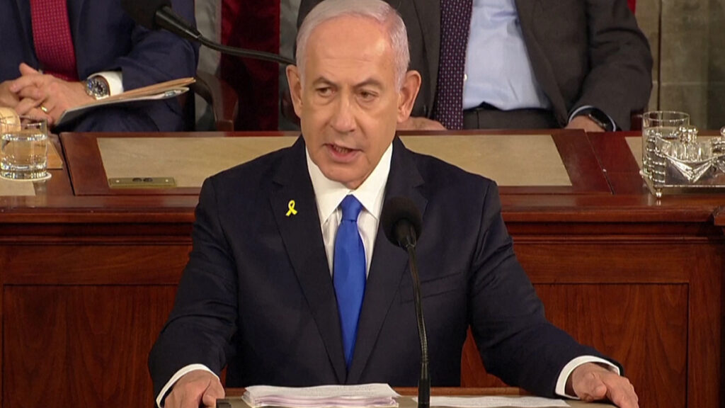 মার্কিন কংগ্রেসে আইনপ্রণেতারা যখন বেনিয়ামিন নেতানিয়াহুকে অভিবাদন জানাচ্ছিলেন, বাইরে তখন বিক্ষোভের আগুন। ক্যাপিটল হিলের সামনে আন্দোলনকারীদের প্ল্যাকার্ড, ব্যানারে নেতানিয়াহুকে বলা হয় ‘ওয়ান্টেড ওয়ার ক্রিমিন্যাল’।