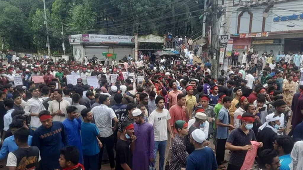 জুমার পর শহরের কোর্ট মসজিদ চত্বর ও অপর প্রান্তে খোয়াই নদের তীরে নূরুল হেরা জামে মসজিদের সামনে বৈষম্যবিরোধী ছাত্র আন্দোলনের আহ্বান করা গণমিছিল কর্মসূচির আয়োজন করা হয়। দীর্ঘ সময় ধরে সাধারণ শিক্ষার্থীরা শহরের কোর্ট মসজিদ প্রাঙ্গণে অবস্থান নিয়ে প্রধান সড়ক অবরোধ করে বিভিন্ন ধরনের স্লোগান দিতে থাকেন। একপর্যায়ে বিএনপি নেতাকর্মীরাও সংহতি জানিয়ে শিক্ষার্থীদের গণমিছিলে যোগ দেন। মিছিলটি টাউন হল এলাকায় পৌঁছালে একই সময়ে চৌধুরী বাজার এলাকার মিছিলটিও টাউন হলে সামনে এসে একত্রিত হয়। এরপর আন্দোলনকারীরা টাউন হল এলাকায় জেলা আওয়ামী লীগের কার্যালয়ে হামলা চালিয়ে অগ্নিসংযোগ করেন। একই সময় তারা জেলা আওয়ামী লীগের সভাপতি ও সংসদ সদস্য মো. আবু জাহিরের বাসভবনের সামনে রাখা চারটি মোটরসাইকেল ও একটি প্রাইভেট কার পুড়িয়ে দেন। একইসঙ্গে আন্দোলনকারীরা আওয়ামী লীগ সভাপতির বাসভবনে ইটপাটকেল নিক্ষেপ করেন। পাশাপাশি টাউন হল এলাকার একটি প্রাইভেট হাসপাতাল, কয়েকটি বিপণিবিতান ও দোকানপাটে ব্যাপক ভাঙচুর করেন।