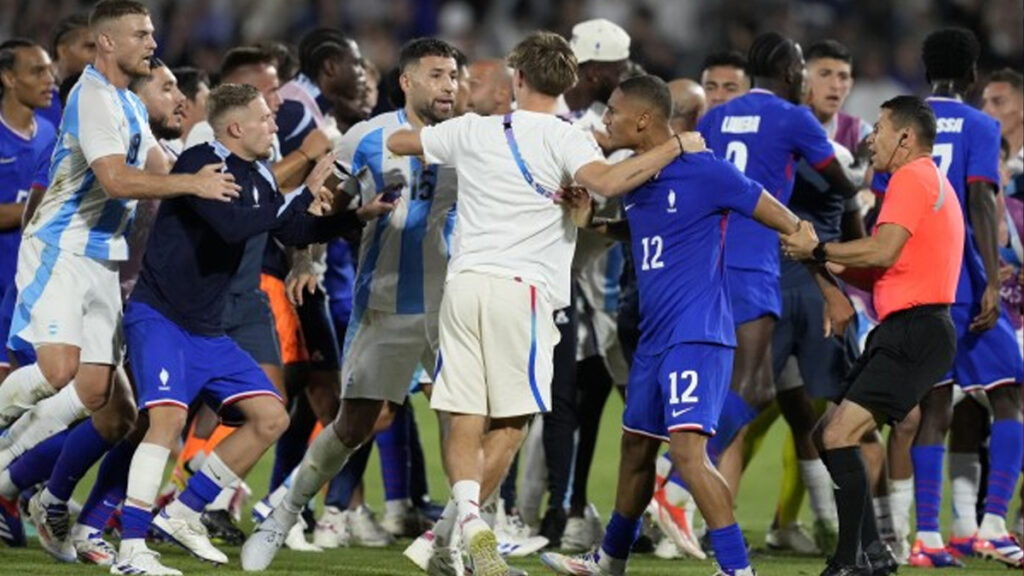 শিরোপা জয়ের স্বপ্ন আর পূরণ হলো না আর্জেন্টিনার। প্যারিস অলিম্পিকের কোয়ার্টার ফাইনালের উত্তেজনাপূর্ণ লড়াইয়ে ফ্রান্সের কাছে হেরে বিদায় নিল তারা। তবে শেষ বাঁশি বাজার পর পরিস্থিতি ভীষণ উত্তপ্ত হয়ে ওঠে। দুই দলের ফুটবলাররা প্রথমে বাকবিতণ্ডা ও পরে জড়িয়ে পড়ে হাতাহাতিতে।