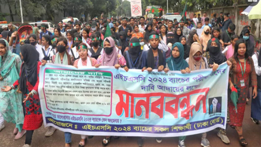 স্থগিত পরীক্ষা ও পুড়ে যাওয়া উত্তরপত্রের ক্ষেত্রে পূর্বের পাবলিক পরীক্ষার ফলাফলের ভিত্তিতে সরাসরি উত্তীর্ণ করার দাবি জানিয়েছে এইচএসসি পরীক্ষার্থীরা। আজ সোমবার (১৯ আগস্ট) দুপুরে ঢাকা মাধ্যমিক ও উচ্চ মাধ্যমিক শিক্ষা বোর্ডের সামনে তারা মানববন্ধন করেন।