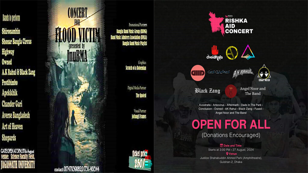 বন্যার্তদের জন্য অর্থ সংগ্রহে পৃথক দুটি কনসার্টের আয়োজন করা হয়েছে। একটি হবে বিচারপতি শাহাবুদ্দিন আহমদ পার্ক অ্যাম্ফিথিয়েটারে এবং অন্যটি জগন্নাথ বিশ্ববিদ্যালয়ে (জবি)।
