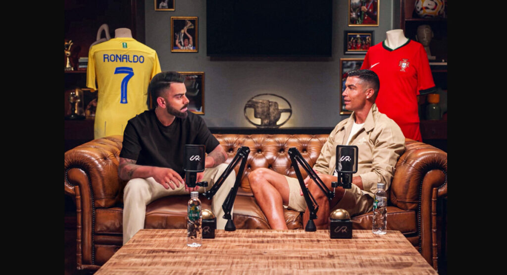 রয়্যাল চ্যালেঞ্জার্স বেঙ্গালুরুর একটি পোস্টের পরই শোরগোল গোটা নেট দুনিয়ায়। কী আছে সেই ছবিতে? দেখা যাচ্ছে, রোনালদোর সঙ্গে বসে আছেন ভিরাট। সামনে মাইক। পিছনে সিআরসেভেনের পর্তুগাল ও আল নাসর দলের জার্সি। এছাড়া ট্রফি হাতে রোনালদোর বিভিন্ন সময়ের ছবি। সব মিলিয়ে যেন পর্তুগিজ কিংবদন্তির ইউটিউব চ্যানেলের চেনা পরিবেশ। আর সেখানেই গল্পে মেতে রয়েছেন কোহলি-রোনালদো।