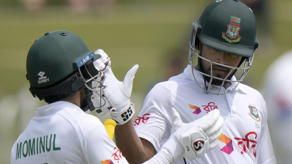 বাংলাদেশ (দ্বিতীয় ইনিংস)- ১৮৫/৪ (৪৬.৪ ওভার) (লক্ষ্য ১৮৫) (জাকির ৪০, সাদমান ২৪, শান্ত ৩৮, মুমিনুল ৩৪, মুশফিক ২২*, সাকিব ২১*)