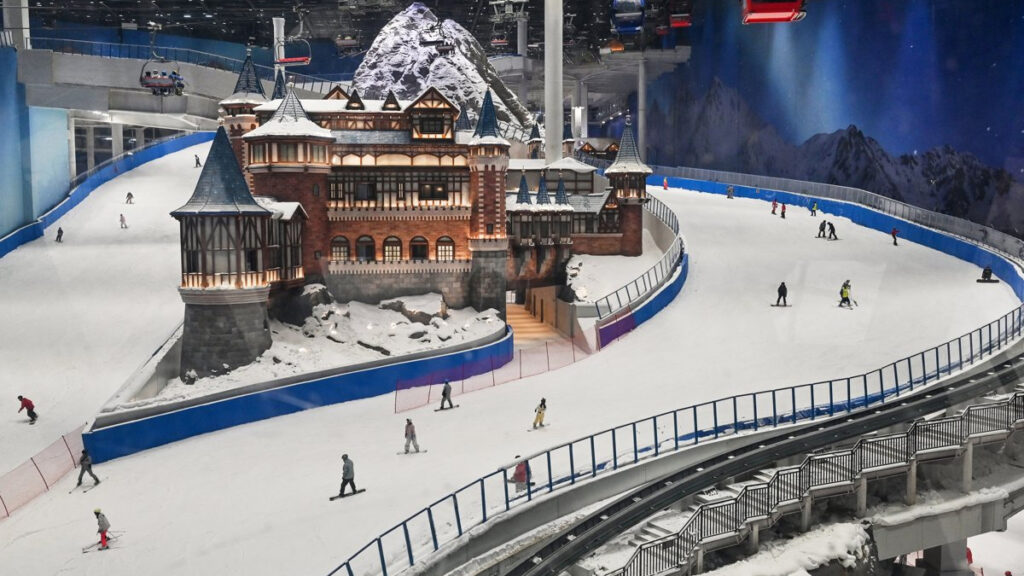 বাহিরে গরম থাকা সত্ত্বেও, ভেতরের পরিস্থিতি একেবারেই ভিন্ন। রিসোর্টে রয়েছে ব্রিজ, গুহা আরও অনেক সারপ্রাইজ। গুহার অভ্যন্তরে তাপমাত্রা শূন্যের নীচে নেমে যায়। তাই, রিসোর্টে স্কি করার সময় পোশাক পরিবর্তন করে নিতে হয়। তবে দর্শকরা মনের মতো সানগ্লাস ও প্যাড পরতে পারবেন। ভেতরে কেউ কেউ ডিজাইনার গগলস বা ব্যাট-উইংড হেলমেট ফ্ল্যাপিং-ও বেছে নিয়েছে স্কি করার জন্য।
