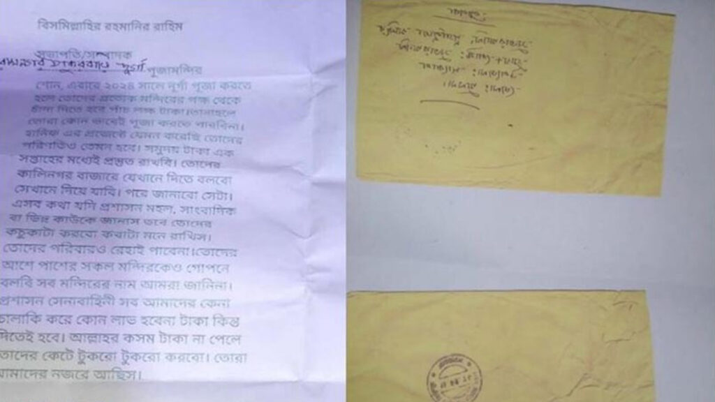 পরিষদের সাধারণ সম্পাদক বিমান সাহা বলেন, পাঁচটি মন্দিরের নামে চিঠি এলেও খবরটি পুরো জেলায় ছড়িয়ে গেছে। সবার মধ্যে ভীতি কাজ করছে। এমন পরিস্থিতিতে এবারের দুর্গাপূজা কিভাবে সম্পন্ন হবে তা আমরা সন্ধিহান।