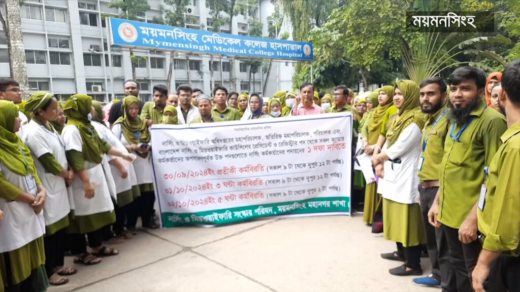 ময়মনসিংহ মেডিকেল কলেজ হাসপাতালেও কর্মবিরতি পালন করেছে নার্সরা। সকালে এক দফা দাবিতে হাসপাতালের প্রশাসনিক ভবনের সামনে জরো হন তারা। এসময় তারা দাবি আদায়ে মিছিল করেন।