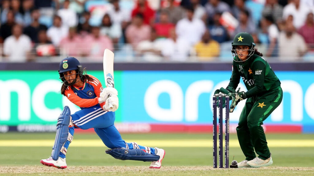 জবাবে ব্যাট করতে নেমে শুরুতেই স্মৃতি মান্ধানাকে হারায় ভারত। ৪৩ রানের জুটি গরে সাময়িক ধাক্কা সামাল দেন জেমিমা ও শেফালি। ৭ রানে শেফালি আউট হলে ভাঙে সেই জুটি। ফাতিমা সানার শিকারে পরিণত হন ২৩ রান করা জেমিমা। তার দ্বিতীয় শিকার রিচা ঘোষ। শেষদিকে অধিনায়ক হারমান প্রীতের ২৯ রানে ভর করে ৪ উইকেট হারিয়ে জয় পায় টিম ইন্ডিয়া।