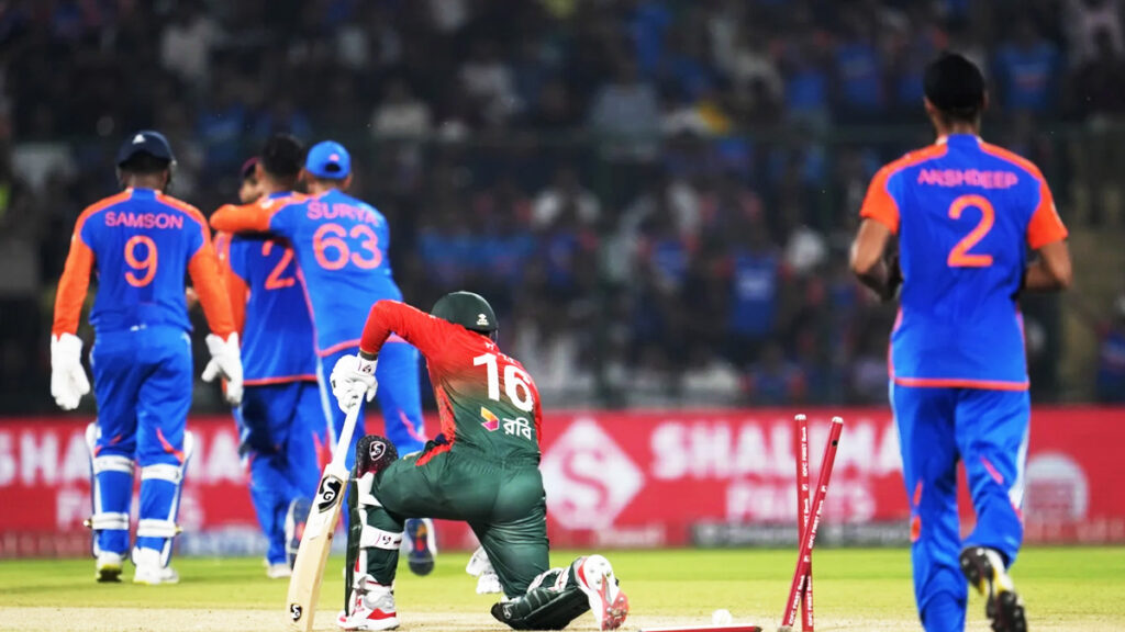 এর আগে, টস হেরে আগে ব্যাট করে নিতিশ-রিঙ্কুর তাণ্ডবে রানের পাহাড় গড়ে ভারত। পাওয়ার প্লের ছয় ওভারে রানের গতি কিছুটা কম থাকলেও এরপর রীতিমতো রানবন্যার উৎসব করে স্বাগতিকরা। বাংলাদেশের পক্ষে বোলিং শুরু করেন মেহেদী হাসান মিরাজ। এক ওভারে ১৫ রান দেয়ায় তার পরিবর্তে তানজিম সাকিবকে বোলিংয়ে আনেন অধিনায়ক নাজমুল হোসেন শান্ত। নিজের প্রথম ওভারের শেষ বলে ওপেনার সঞ্জু স্যামসনকে সাজঘরে ফেরান তাসকিন। ব্যক্তিগত ১০ রানে শান্তর হাতে ক্যাচ তুলে দিয়ে প্যাভিলিয়নে ফেরেন সঞ্জু।
