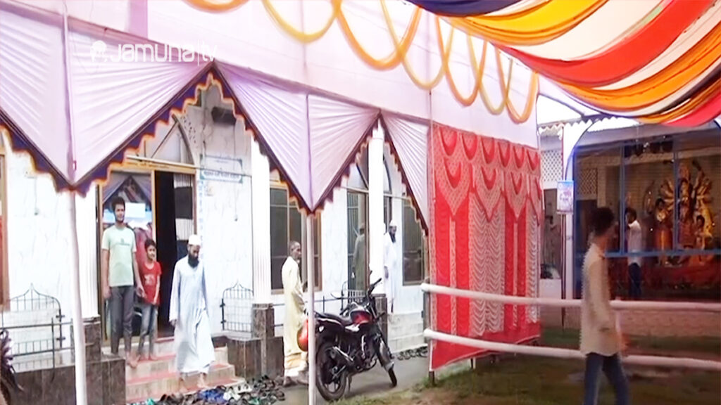 মসজিদ-মন্দির সংলগ্ন খোলা জায়গায় দুর্গাদেবীর মণ্ডপ স্থাপন করা হয়েছে। আবার এখানেই জানাজা ও ওয়াজ মাহফিলের আয়োজন করেন মুসলিমরা। নামাজের সময়সূচি মিলিয়ে বন্ধ রাখা হয় পূজা-অর্চনা। মিলেমিশে নিজ নিজ ধর্ম পালন করছেন সবাই।