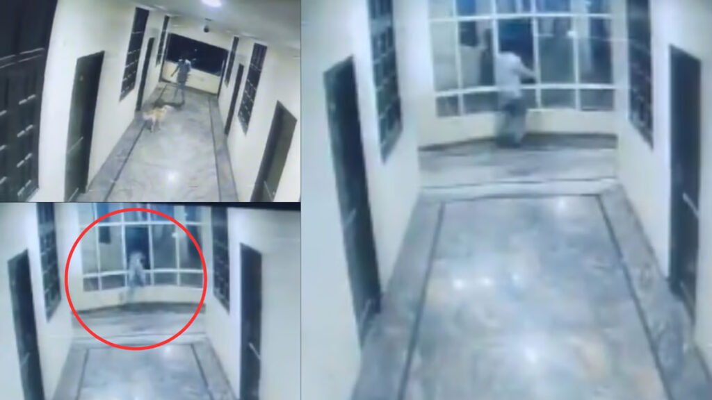 গোটা ঘটনা ধরা পড়েছে বারান্দায় বসানো সিসি ক্যামেরায়। ভিডিওতে দেখা গিয়েছে, বারান্দার এক প্রান্ত থেকে অন্য প্রান্তে কুকুরটিকে ধাওয়া করে পেছনে পেছনে ছুটছিলেন যুবক।