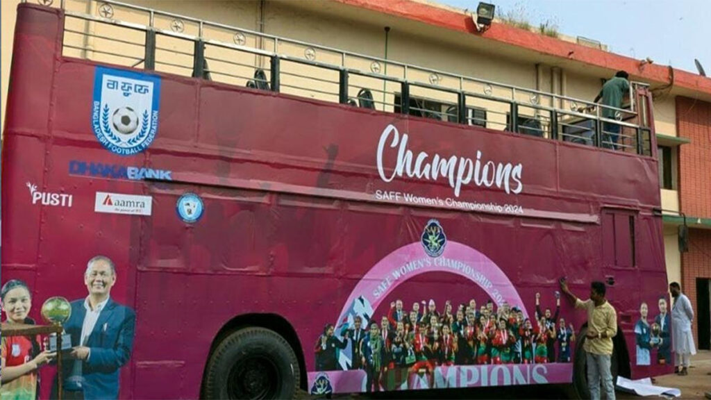 বাঘিনীদের জমকালো সংবর্ধনা দিতে প্রস্তুত করা হয়েছে সড়ক পরিবহন করপোরেশনের (বিআরটিসি) একটি ছাদখোলা বাসের। বাসটিতে চ্যাম্পিয়ন ফুটবলারদের শহর প্রদক্ষিণ করানো হবে বলে জানিয়েছেন বাংলাদেশ ফুটবল ফেডারেশনের (বাফুফে) কর্মকর্তারা।