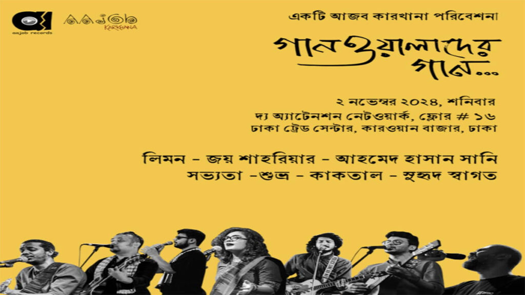 ‘গানওয়ালাদের গান’। নামটা অন্য কনসার্টের চেয়ে ব্যতিক্রম। কেন এমন নামকরণ? কারণ, এখানে শিল্পীদের সবাই গায়ক-গীতিকার-সুরকার। আর এই ব্যতিক্রমী আয়োজনটি করেছে শিল্পী জয় শাহরিয়ারের প্রতিষ্ঠান ‘আজব কারখানা’।