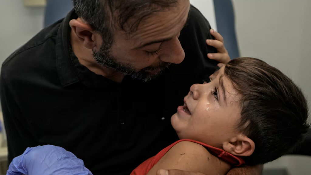 বাবার কোলে ব্যথায় কাতরাচ্ছে ৪ বছর বয়সী লেবানিজ শিশু হোসেন মিকদাদ। চিকিৎসার জন্য যখনই ডাক্তার আসছেন, তখনই ব্যথায় এক পা দিয়ে ডাক্তারকে সরিয়ে দিচ্ছে হোসেন। আর চিৎকার করে উঠছে বাবা! বাবা! বলে। হোসেন বলছে,’উনাকে (ডাক্তার) বলো আমাকে একা ছেড়ে দিতে। প্রচণ্ড ব্যথার যন্ত্রণায় চোখ ঠেকে পানি থামছেই না। সন্তানের এই অবস্থা দেখে ছেলেকে বুকে জড়িয়ে ধরছেন বাবা। আর লুকিয়ে লুকিয়ে কাঁদছেন।
