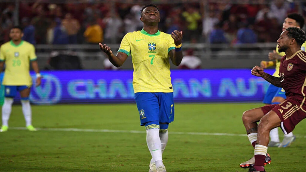ক্লাব ফুটবলে দুর্দান্ত ছন্দে থাকা ভিনিসিয়াস জুনিয়র জাতীয় দলে এসে আরেকবার হয়েছেন ব্যর্থ। এই তারকা ফুটবলারের পেনাল্টি মিসের কারণে ১০ জনের ভেনেজুয়েলার বিরুদ্ধে জয় পেলো না ব্রাজিল। ম্যাচে এগিয়ে গিয়েও লিড ধরে রাখতে পারেনি সেলেসাওরা।