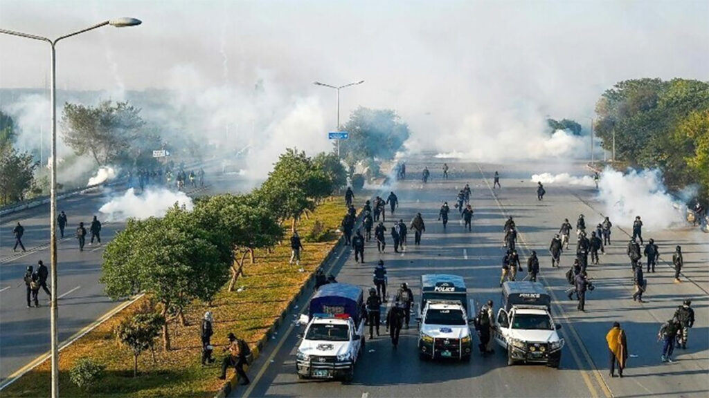 পাকিস্তানের বিরোধীদলীয় নেতা ইমরান খানের মুক্তির দাবিতে উত্তাল দেশটির রাজধানী ইসলামাবাদ। ১৪৪ ধারা ভঙ্গ করেই ইমরান খানের স্ত্রী বুশরা বিবি ও পাকিস্তান তেহরিক-ই-ইনসাফের (পিটিআই) নেতাদের নেতৃত্বে ইসলামাবাদ শহরের কেন্দ্রস্থল ডি-চক পৌঁছে গেছে পিটিআইয়ের হাজারও বিক্ষোভকারী। এরইমধ্যে সেই এলাকা রণক্ষেত্রে পরিণত হয়েছে। পরিস্থিতি নিয়ন্ত্রণে আনতে নিরাপত্তা বাহিনী বিক্ষোভকারীদের ওপর কাঁদানে গ্যাসের শেল ছুড়ছে। সংঘর্ষে ইতোমধ্যে ছয়জনের নিহতের খবর পাওয়া গেছে।