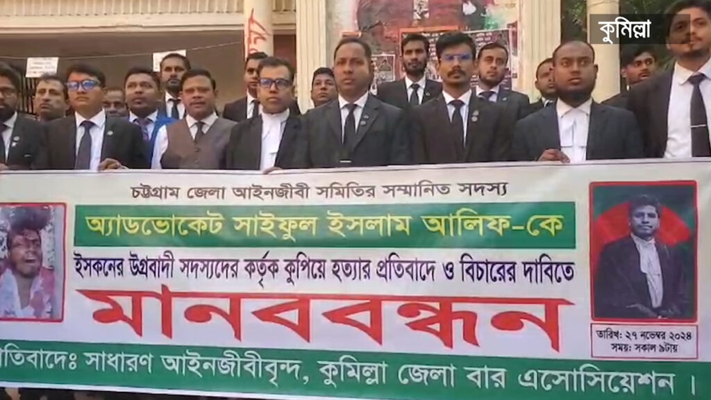 কুমিল্লা জেলা ও দায়রা জজ আদালতের সামনে বিক্ষোভ ও মানববন্ধন করেন জেলা আইনজীবী সমিতির সদস্যরা। প্রতিবাদ সমাবেশ থেকে তারা সাইফুল ইসলাম আলিফ হত্যাকাণ্ডে জড়িতদের দ্রুত গ্রেফতারের দাবি জানান।