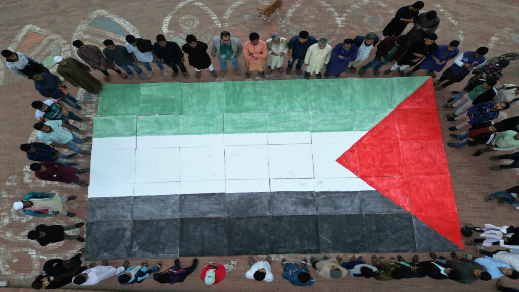 আন্তর্জাতিক ফিলিস্তিন সংহতি দিবস উপলক্ষে ফিলিস্তিনের মানব পতাকা প্রদর্শন করেছেন জাহাঙ্গীরনগর বিশ্ববিদ্যালয়ের (জাবি) শিক্ষার্থীরা। শুক্রবার (২৯ নভেম্বর) বিকেলে বিশ্ববিদ্যালয়ের কেন্দ্রীয় শহিদ মিনার প্রাঙ্গণে ‘বৈষম্যবিরোধী ছাত্র আন্দোলনের’ ব্যানারে এ কর্মসূচি পালিত হয়।