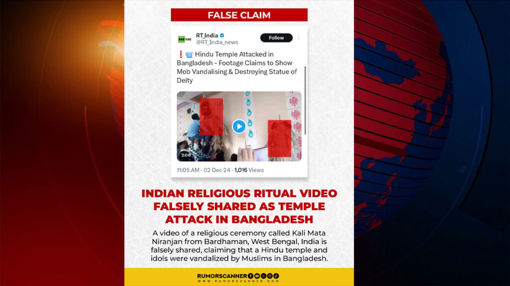 তবে, ব্যাপকভাবে ছড়িয়ে পড়া ওই ভিডিওটি বাংলাদেশের নয়, বরং ভারতের পশ্চিমবঙ্গের বর্ধমানের বলে জানিয়েছে তথ্য যাচাইকারী সংস্থা রিউমার স্ক্যানার। সোমবার ভিডিওটি সম্পর্কে রিউমার স্ক্যানার এক ফেসবুক পোস্টে জানায়, বাংলাদেশের বলে দাবি করা ওই ভিডিওটি প্রকৃতপক্ষে ভারতের পশ্চিমবঙ্গের বর্ধমানের একটি কালীমন্দিরের।