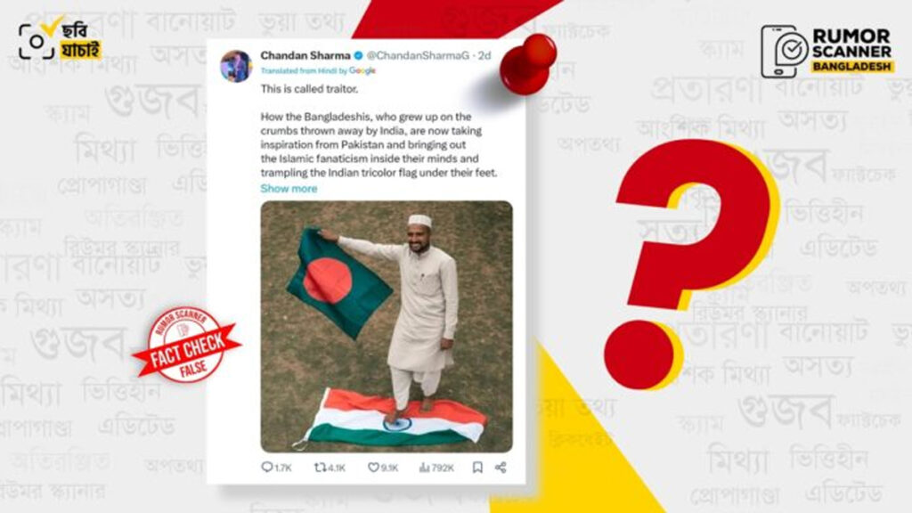 বাংলাদেশের জাতীয় পতাকা হাতে পাঞ্জাবি ও টুপি পরা এক ব্যক্তিকে ভারতের জাতীয় পতাকা পায়ে মাড়াতে দেখা যায়, এমন একটি ছবি সম্প্রতি ছড়িয়ে পড়েছে। যেটি কৃত্রিম বুদ্ধিমত্তা বা এআই দিয়ে তৈরি বলে জানিয়েছে ফ্যাক্ট চেক বা তথ্য যাচাইয়ের মাধ্যম রিউমার স্ক্যানার।