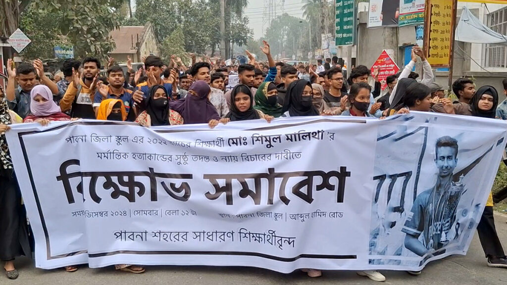 পাবনায় ওয়াজ মাহফিলে তুচ্ছ ঘটনাকে কেন্দ্র করে শিক্ষার্থী শিমুল মালিথা হত্যার বিচারের দাবিতে বিক্ষোভ মিছিল ও সমাবেশ করেছে সাধারণ শিক্ষার্থীরা।