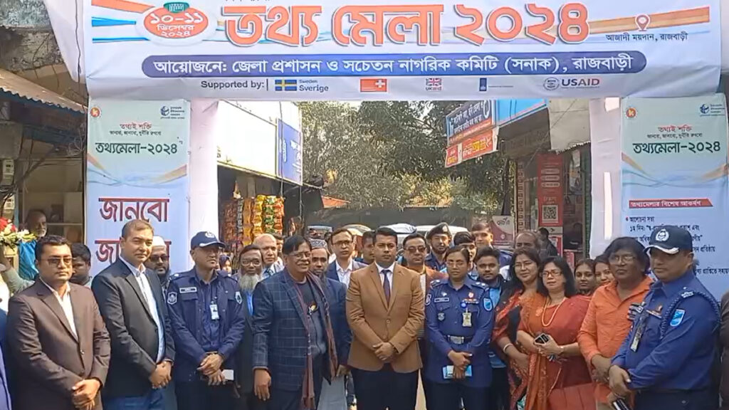 তথ্য মেলার উদ্বোধনী সভায় রাজবাড়ী সনাক সভাপতি প্রফেসর মোঃ নুরুজ্জামানের সভাপতিত্বে প্রধান অতিথি হিসাবে উপস্থিত ছিলেন জেলা প্রশাসক মোহাম্মদ জাহিদুল ইসলাম মিঞা।