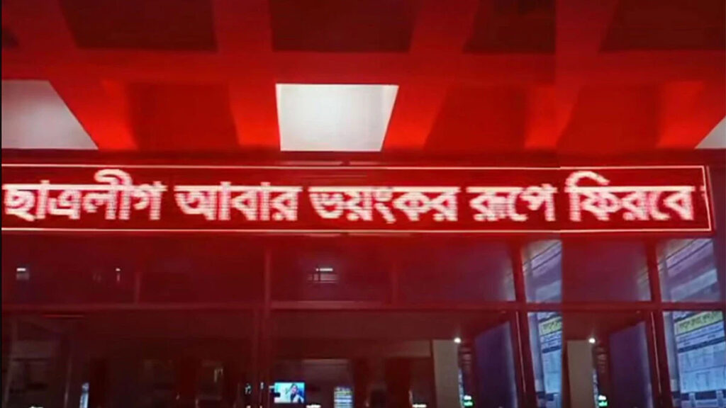 খুলনা রেলস্টেশনের ডিজিটাল বিলবোর্ডে ষ্টেশনের মূল ফটকে ‘ছাত্রলীগ আবার ভয়ংকর রূপে ফিরবে জয় বাংলা জয় বঙ্গবন্ধু শেখ হাসিনা আবার আসবে’ এমন একটি লেখা প্রকাশ করা হয়। শনিবার (১৪ ডিসেম্বর) রাত সাড়ে ৮টার দিকে এ ঘটনা ঘটে।