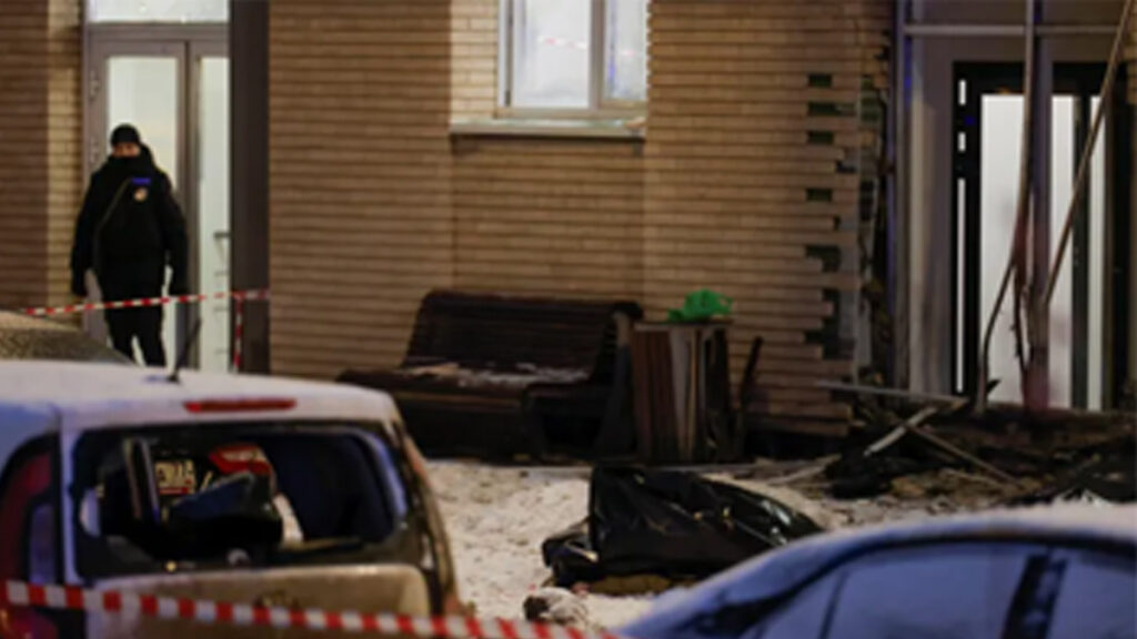 রাশিয়ান টেলিগ্রাম চ্যানেলে পোস্ট করা এক ছবিতে ধ্বংসস্তুপে পরিণত হওয়া একটি ভবনের ভাঙা প্রবেশপথ এবং তুষারে পড়ে থাকা দুটি রক্তাক্ত লাশ দেখা গেছে।