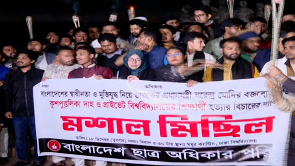 বৃহস্পতিবার (১৮ ডিসেম্বর) সন্ধ্যায় ঢাকা বিশ্ববিদ্যালয়ে মশাল মিছিল করে ছাত্র অধিকার পরিষদ। তাদের প্রতিবাদ সমাবেশের বড় অংশ জুড়ে ছিল বিজয় দিবসে ভারতীয় প্রধানমন্ত্রী নরেন্দ্র মোদির বিতর্কিত বক্তব্য। প্রতিবাদ সমাবেশ শেষে দাহ করা হয় মোদির কুশপুত্তলিকা।